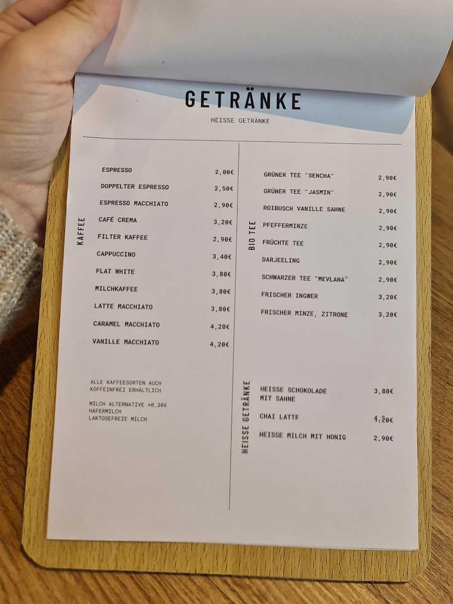 Beverages available include various coffee preparations such as Cappuccino and Eiskaffee, alongside tea options including Pfefferminztee. The menu supports casual dining experiences where customers can enjoy breakfast, coffee breaks, or midday light meals.