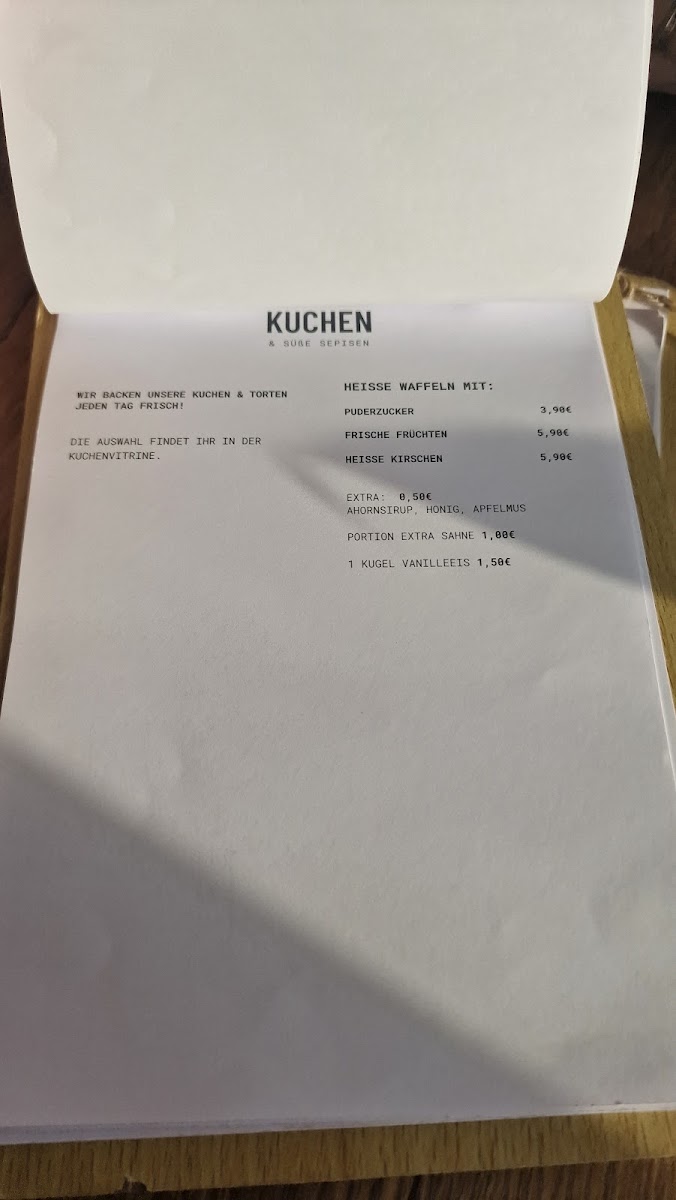 For those seeking lighter fare or snacks, choices include fresh baked goods such as Waffeln served with fruits, and bread topped with avocado and rucola. The menu extends into desserts featuring a range of cakes and pastries like Käsekuchen mit Mandarinen, Schwarzwälder-Kirsch-Torte, Zitronenrolle, Cheesecake San Sebastian, and Mohn-Marzipan-Torte.